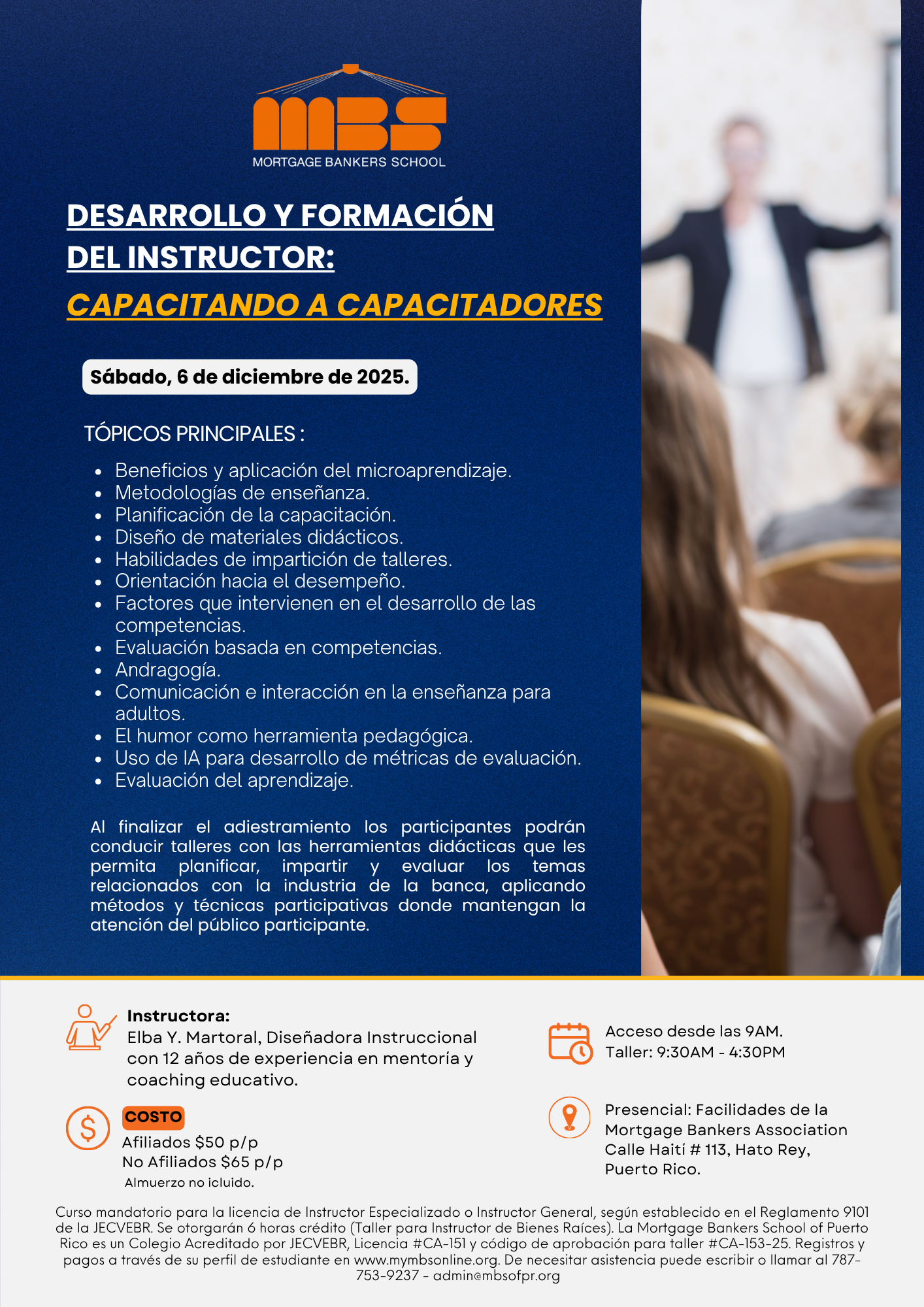Al finalizar el adiestramiento los participantes podrán conducir talleres con las herramientas didácticas que les permita planificar, impartir y evaluar los temas relacionados con la industria de la banca, aplicando métodos y técnicas participativas donde mantengan la atención del público participante.