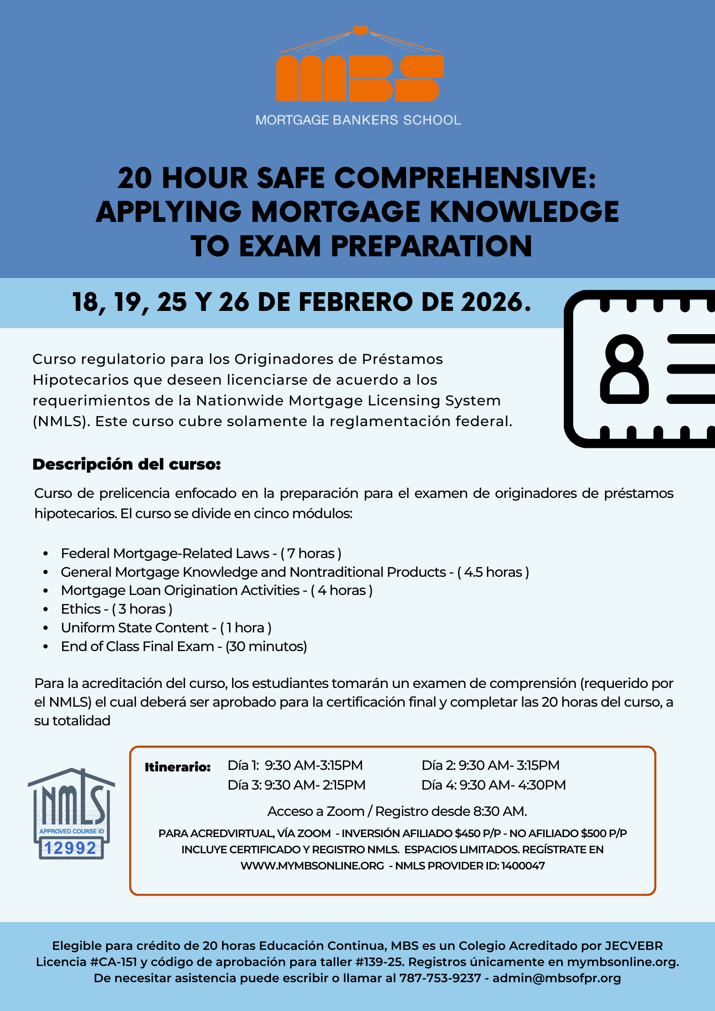 Curso regulatorio para los Originadores de Préstamos Hipotecarios que deseen licenciarse de acuerdo a los requerimientos de la Nationwide Mortgage Licensing System (NMLS). Este curso cubre solamente la reglamentación federal.