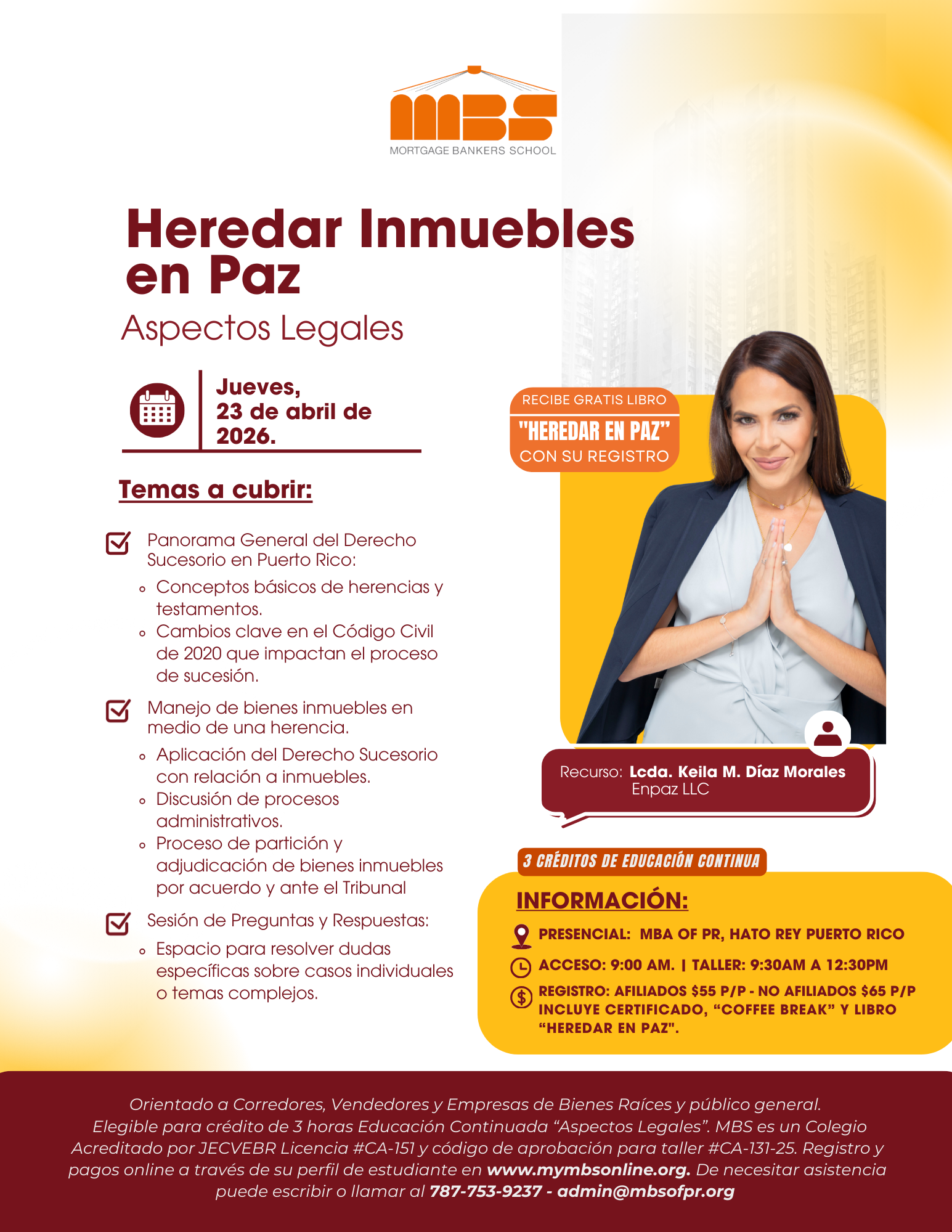 El taller será impartido por la Lcda. Keila M. Díaz Morales, fundadora de Enpaz LLC, abogada-notaria con más de 10 años de experiencia, exjueza, autora del libro “Heredar en Paz: Conoce cómo gestionar herencias en armonía y validar el duelo” y coautora del cuaderno “El Amor y el Interés” y las memorias “Vivamos Mientras. La Lcda. Keila M. Díaz Morales es también colaboradora frecuente en medios de comunicación y programas de televisión, ofreciendo orientación legal a la comunidad. Su enfoque en la planificación patrimonial abarca tanto el aspecto técnico como el emocional, promoviendo la paz y la justicia en procesos de herencias.