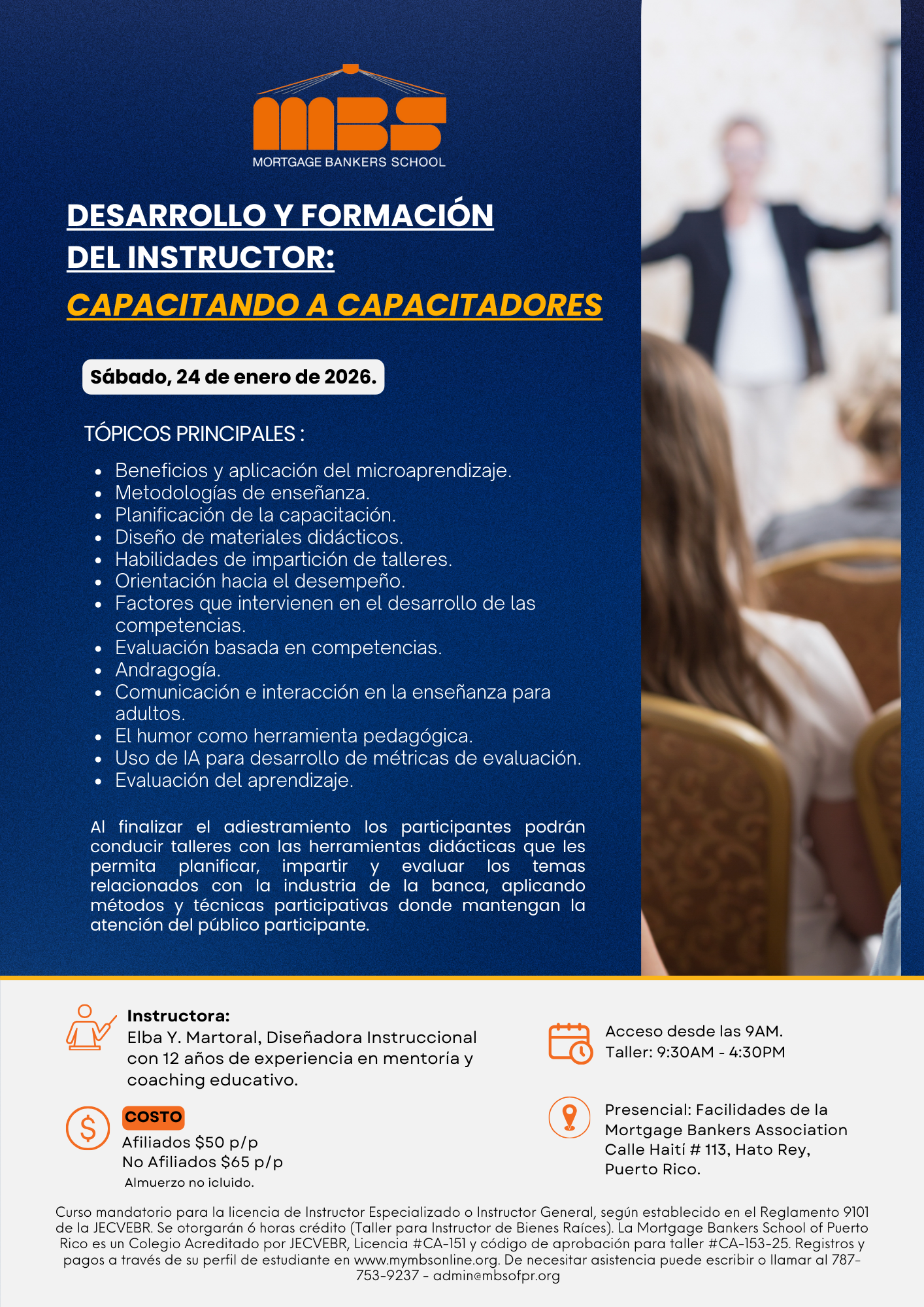 Al finalizar el adiestramiento los participantes podrán conducir talleres con las herramientas didácticas que les permita planificar, impartir y evaluar los temas relacionados con la industria de la banca, aplicando métodos y técnicas participativas donde mantengan la atención del público participante.